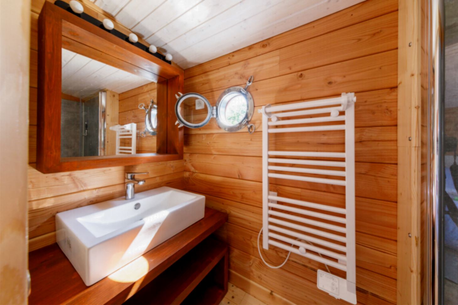 Sanitaire : salle d’eau avec douche et lavabo, serviettes de toilette, WC séparé.